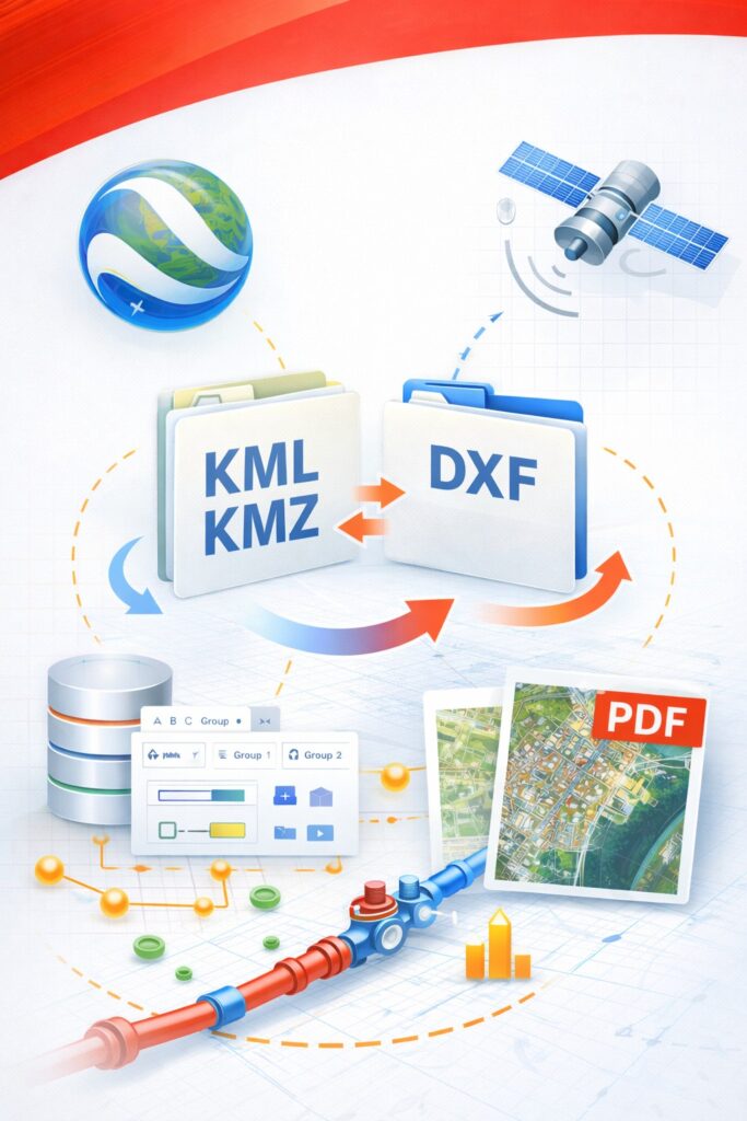 - Importazione avanzata di KML/KMZ e DXF, con riconoscimento automatico della condotta principale (colorata in blu).